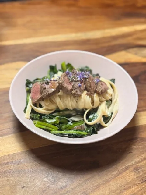 Serve: Twirl the pasta using kitchen tongs, arrange the spinach around the pasta, slice the rested venison steaks and top with the rosemary flowers
