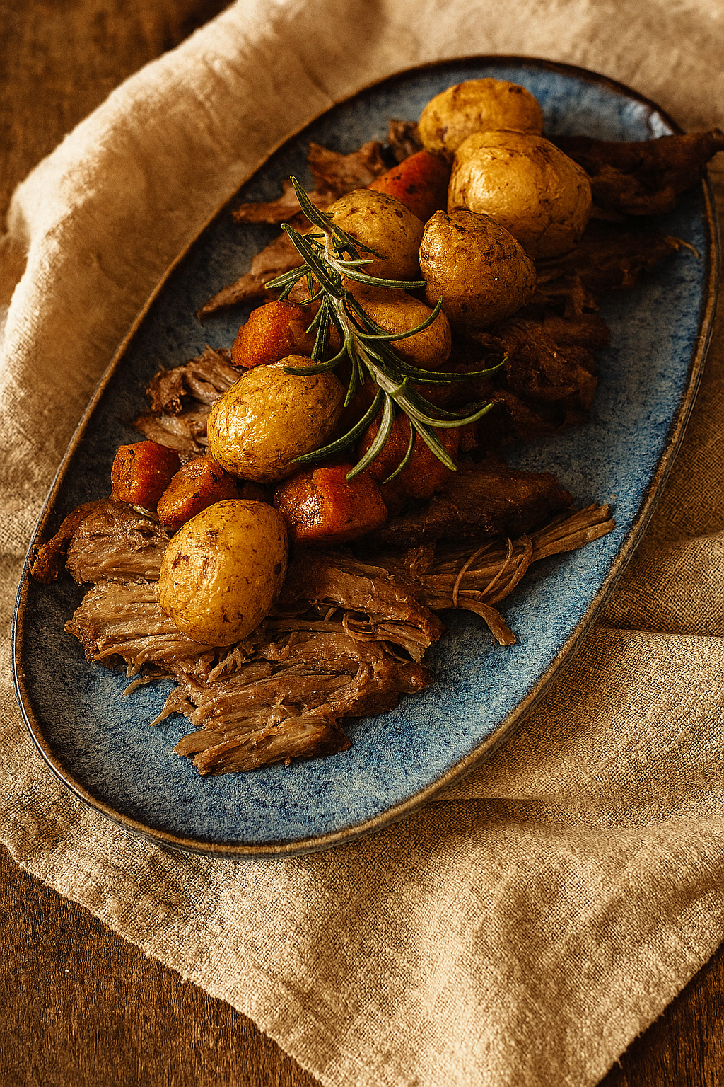 Use a heavy cast iron pot with a lid. Place the meat on some of your favourite roasting vegetables like sliced onions, zucchini, sweet potatoes, also fresh herbs like thyme and rosemary are great to scatter around the meat and vegetables.