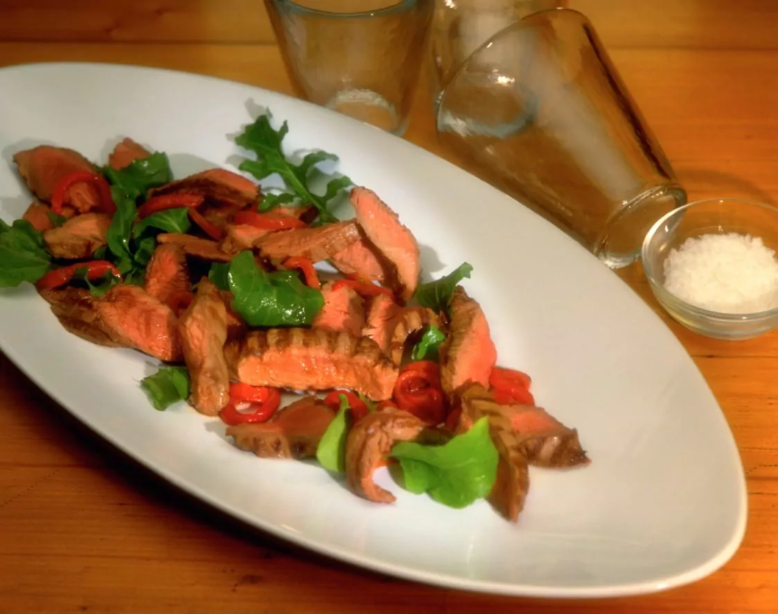 Heat a little oil in a pan, add the wallaby topsides and cook for a few minutes either side until medium rare. Set aside to rest for 5 minutes before cutting perpendicular to the grain into thin slices.