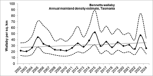 The Tasmanian Government has monitored wallaby density trends annually for the past 48 years. They use a highly refined technique for monitoring the health of the wallaby population. Wallaby densities vary with seasonal conditions, but their populations have steadily increased over the last 20 years despite the consistently high annual cull. Every year, many thousands of wallaby are culled on farm land under Crop Protection Permits. Lenah utilises only 10% of the current cull.